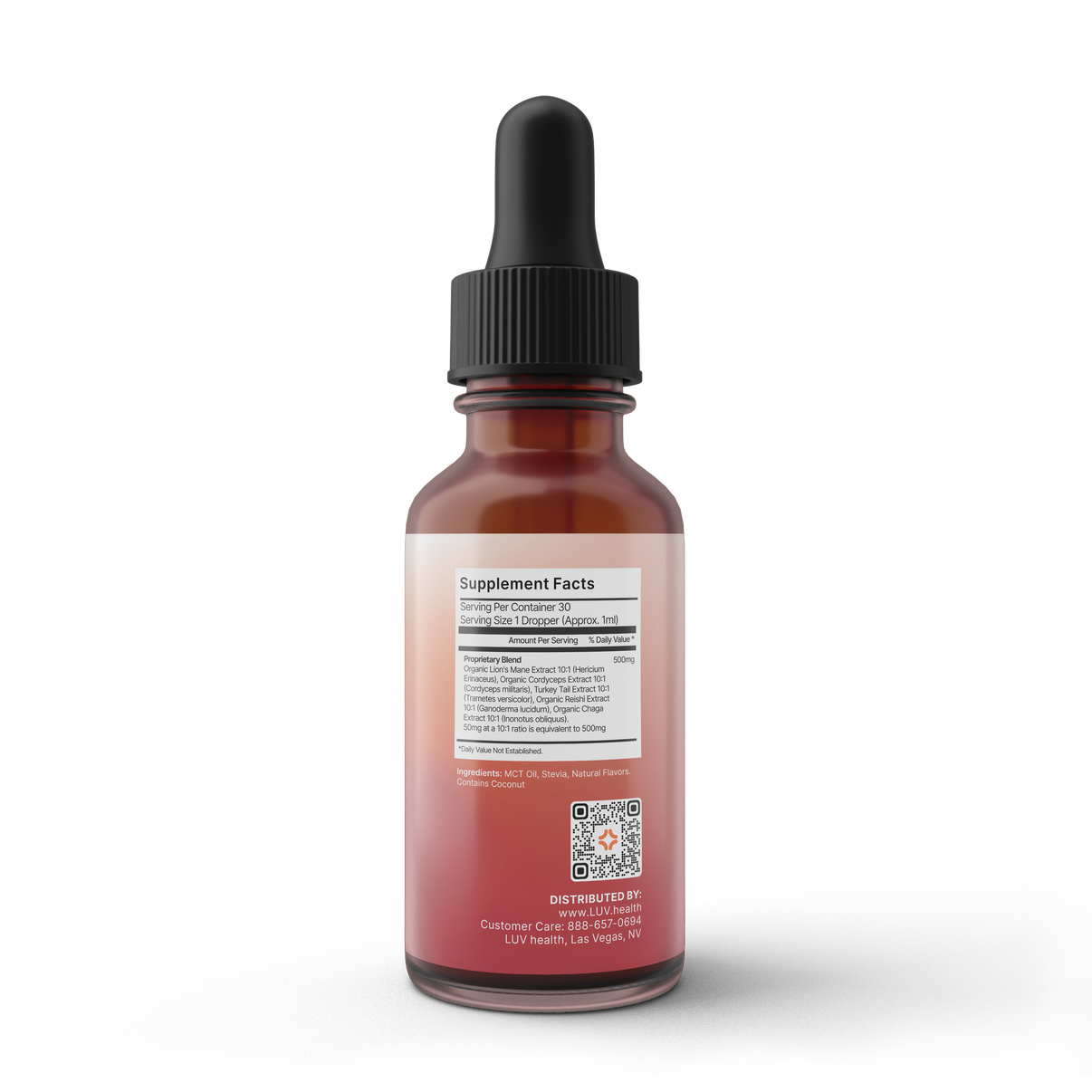 The LUV Flow drops are the perfect indicator for health in an age when everyday demands can become overwhelming. With a carefully crafted formula that makes use of the power of Organic Adaptogenic Mushrooms The drops provide the most natural, safe and efficient solution to fight everyday stress, improve mental clarity, and enhance overall health.